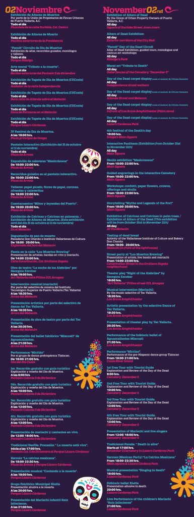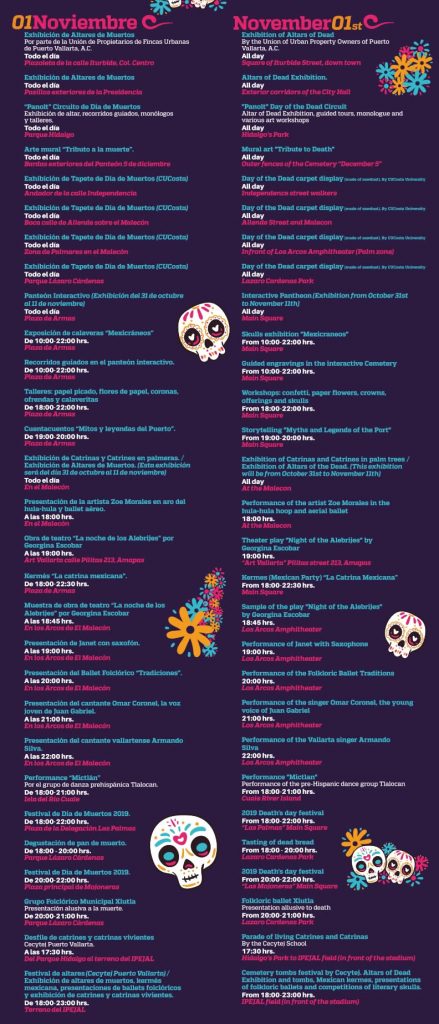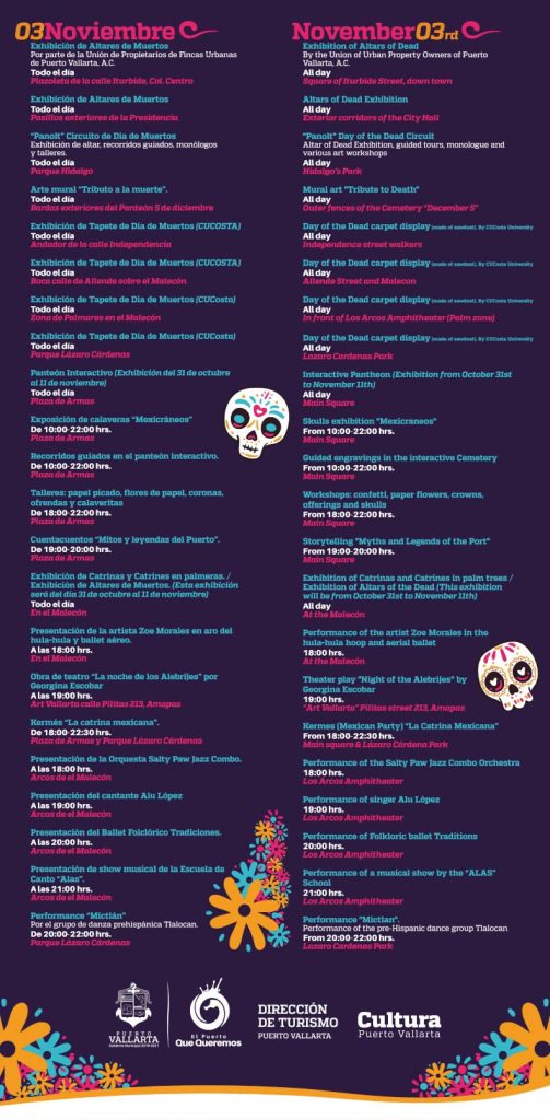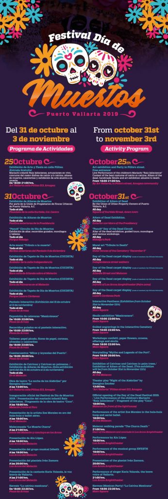 Del  Jueves 31 de octubre al 03 de noviembre, ven a descubrir las múltiples actividades culturales y artísticas que Puerto Vallarta tiene preparado, para que disfrutes de las tradiciones del Festival de Día de Muertos y del excelente ambiente del folklore, música y sabores, y por supuesto, los colores de la exhibición de altares y ofrendas a lo largo del centro histórico.