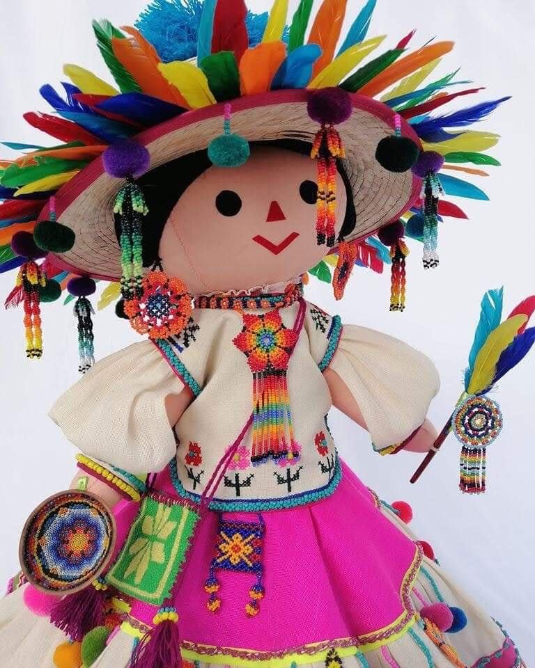 Pero sin lugar a dudas la mueca de trapo Wixarika se lleva las palmas por sus detalles y réplica exacta del atuendo de Huichol. Los accesorios coloridos como los collares, aretes y morral le dan perfección a este trabajo artesanal.